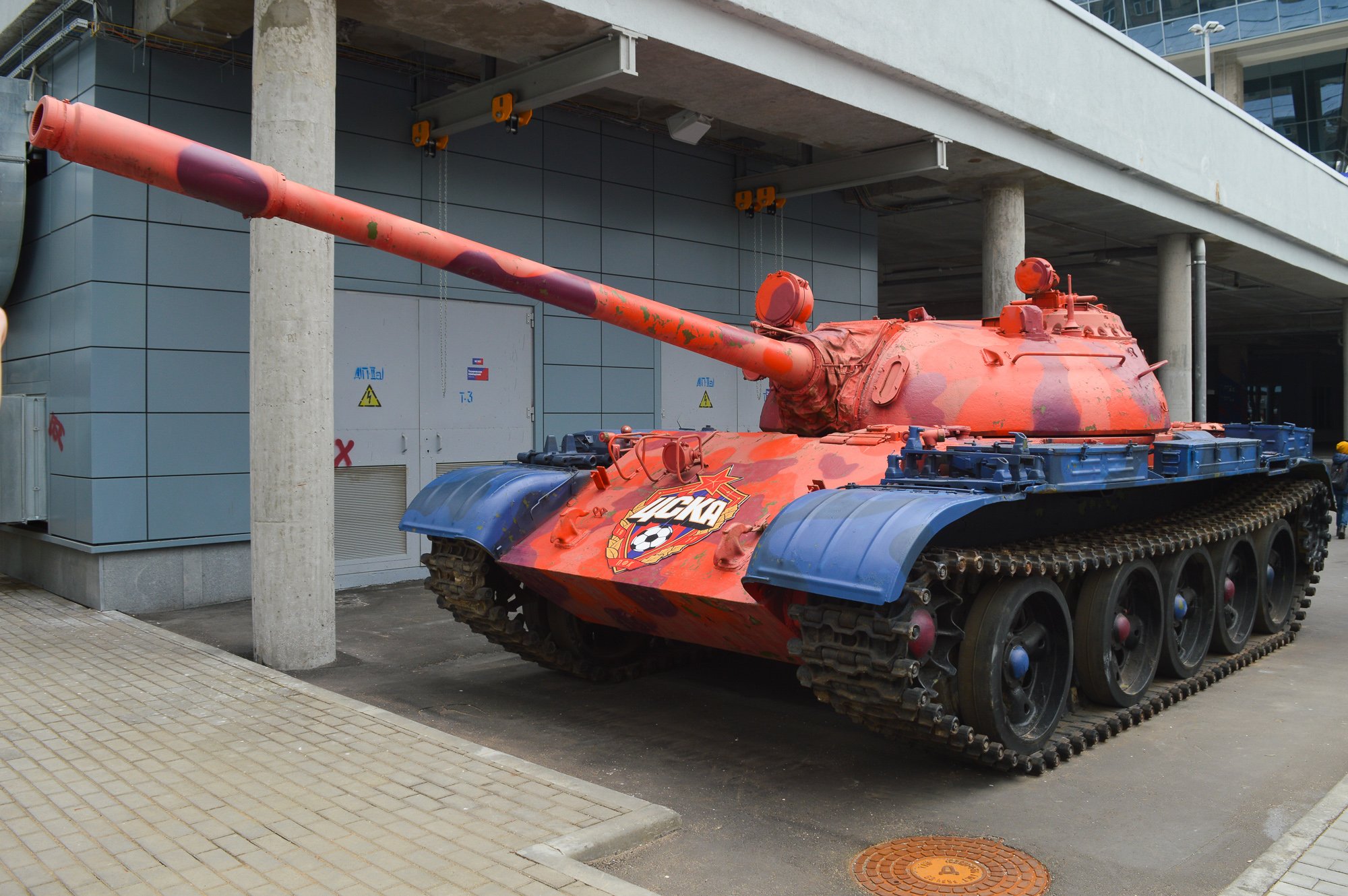 Танк в красно-синих цветах ЦСКА подарили клубу, когда завершилось строительство стадиона. Между прочим, это первый советский танк, в котором можно пережить ядерный удар. Особенно популярен Т-55 у молодоженов, часто приезжающих сюда на свадебные экскурсии.