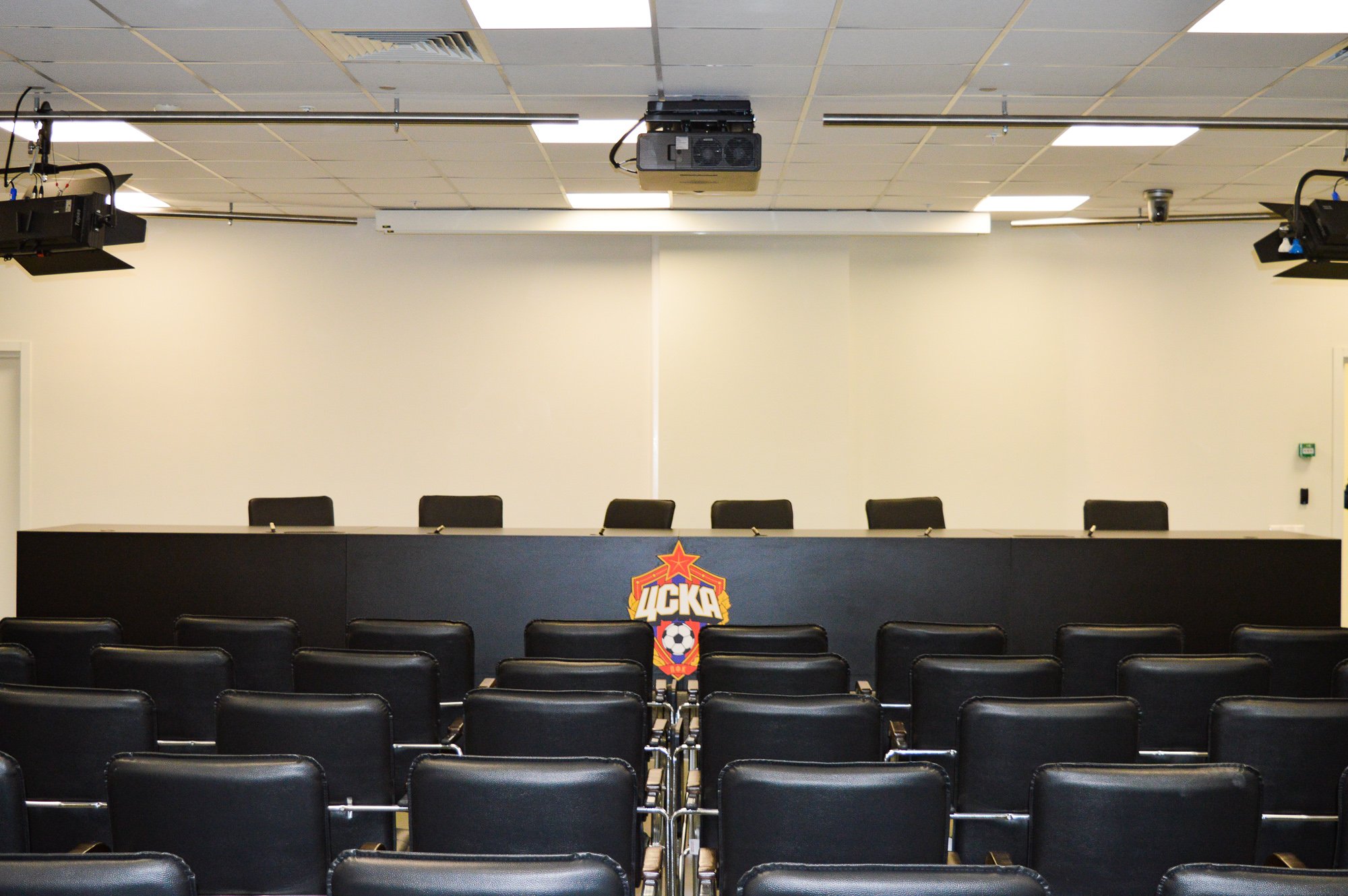 Возвращаемся внутрь стадиона. Заглядываем в комнату для работы журналистов и зал пресс-конференций.